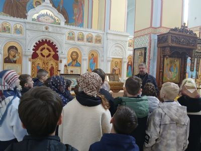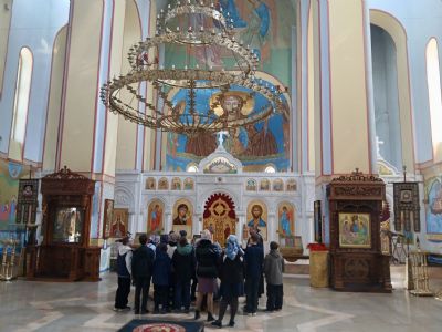 Отец Виталий рассказал ребятам, что Храм — это место, где совершаются богослужения, в том числе главное из них — Божественная литургия. Наш собор пятиглавый, самый большой купол символизирует Господа Иисуса Христа, остальные поменьше — четырех евангелистов. Высота собора 43.5 метра. Здание кафедрального собора выполнено в традициях владимирско-суздальской храмовой архитектуры, для которой характерны строгие формы с минимальным количеством декоративных деталей. В соборе два этажа и два храма. В летнее время после Пасхи экскурсии проводятся в верхнем храме.