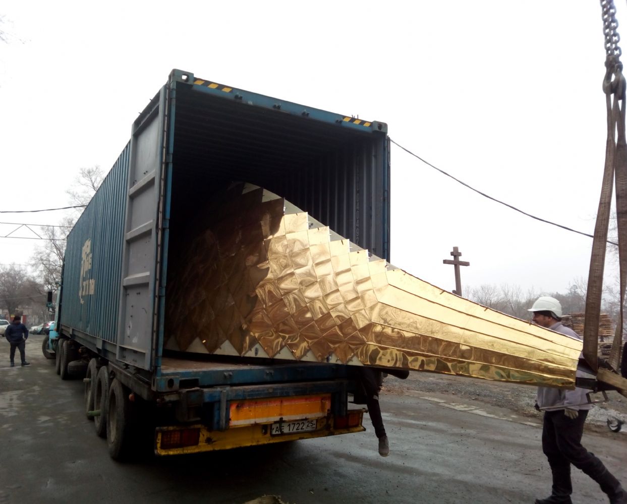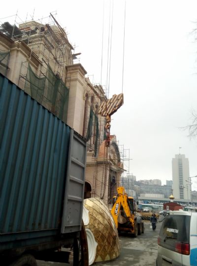 Первые контейнеры пришли на стройку в Вербное воскресенье. Всего в партию груза, поставляемого от производителя церковного убранства из Ростовской области, входят четыре основных купола. В последующие месяцы ожидается также поставка большого купола.