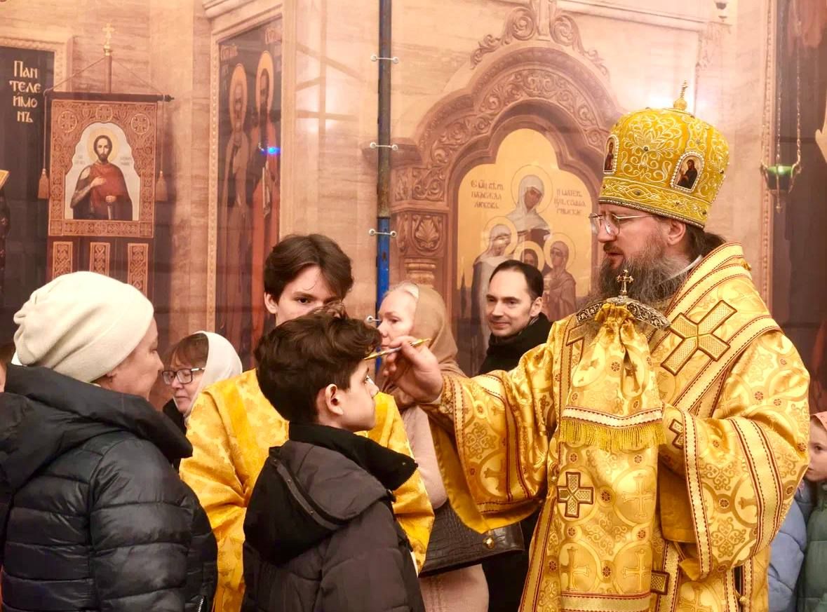 За богослужением было совершено освящение пяти хлебов, вина и елея. Архипастырь помазал молящихся освященным елеем, символизирующим милость Божию ко всем людям.