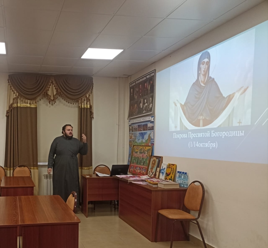 Лекцию провёл Даниил Сергеевич Кравцов, сотрудник отдела религиозного образования и катехизации Арсеньевской епархии. Даниил Сергеевич обозначил исторические события Праздника, Его значение в православном мире и период начала празднования Праздника Покрова на Руси.