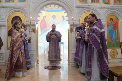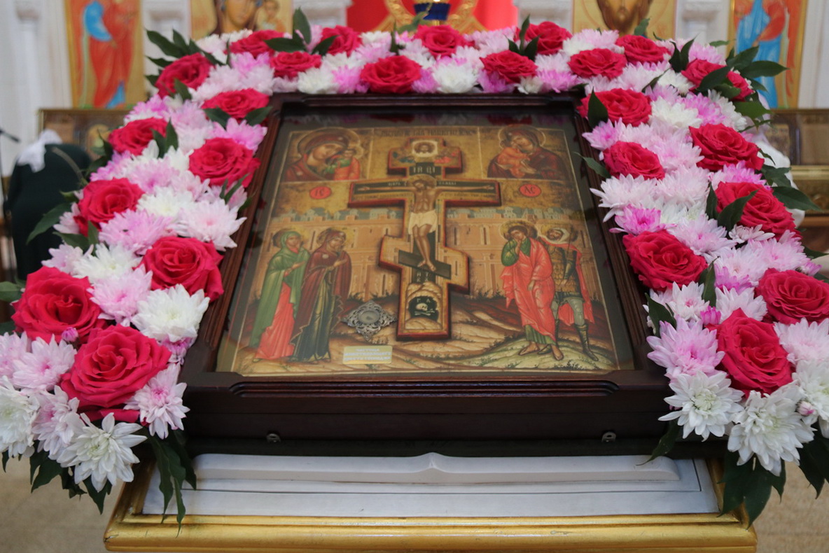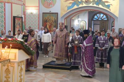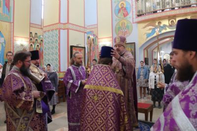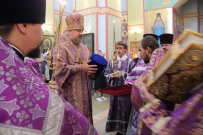 По заамвонной молитве епископ Николай, в сослужении духовенства собора, совершил праздничное славление Животворящему Кресту и обратился к присутствующим с архиерейским словом.По окончании богослужения был организован сбор средств для мирных жителей Донбасса, Новороссии и обстреливаемого приграничья.