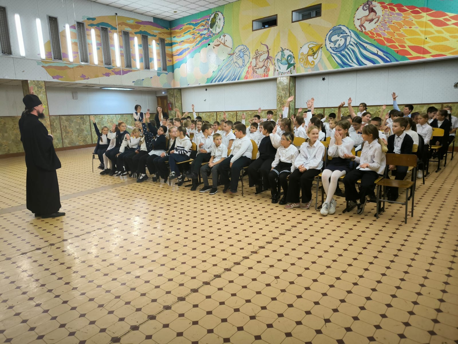 Такая обширная тема была выбрана для разговора священнослужителя с учениками 4-ых классов в СОШ №20 п. Врангель. Беседу, по благословению епископа Николая, провел иеродиакон Филарет (Каширский).