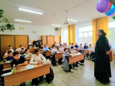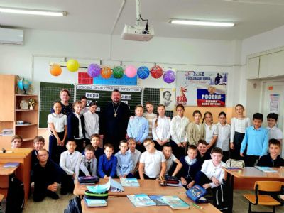 Иерей Виталий Шаркеев, руководитель миссионерского отдела Находкинской епархии, провел урок по модулю «Основы православной культуры» для учащихся 4-го «Б» класса школы № 14 на тему «Библейская история».