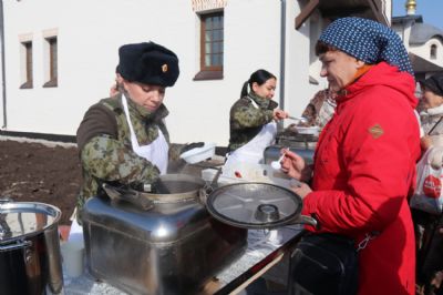 После молебна около храма Максима Исповедника всех желающих ждала полевая кухня – гречневая каша, ароматный чай, пряники.