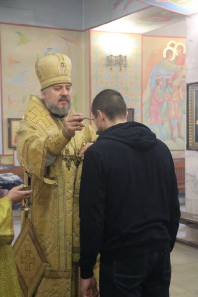 После чтения уставного зачала из Святого Евангелия, епископ Николай, помазал духовенство и мирян храма освященным елеем.