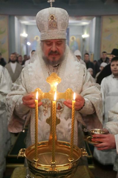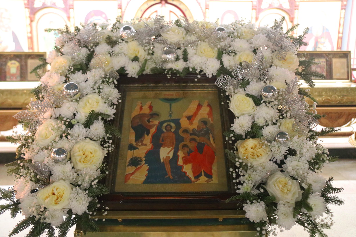 По заамвонной молитве епископ Николай в сослужении духовенства собора совершил чин Великого освящения воды, по окончании которого возглавил праздничное славление и обратился к молящимся с проповедью о празднике Святого Богоявления: