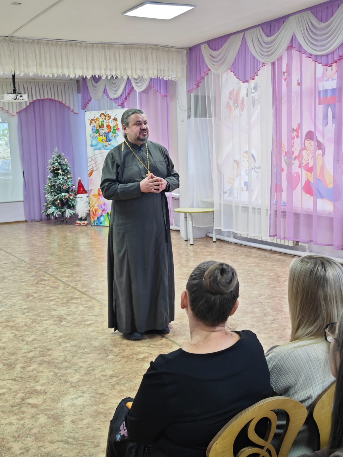 Иерей Виталий Шаркеев, руководитель миссионерского отдела Находкинской епархии, по приглашению администрации образовательного учреждения посетил детский сад №8 г. Находки и встретился с родителями дошкольников.