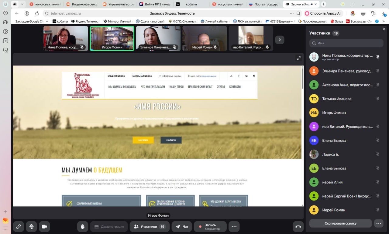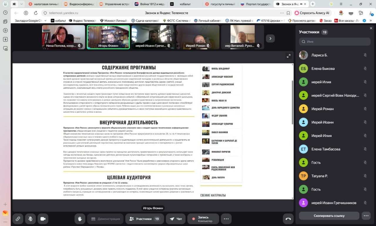 В рамках проекта «Помним историю, сохраняем традиции» прошло онлайн-обучение по программе духовно- нравственного воспитания "Имя России"»Программа реализуется храмом святого благоверного князя Александра Невского при МГИМО, настоятель протоиерей Игорь Фомин. В качестве основы программы используются выдающиеся исторические личности, внесшие существенный вклад в формирование и укрепление российской государственности, и являющие собой высокий личностный духовно-нравственный жизненный пример для воспитания современной молодежи.