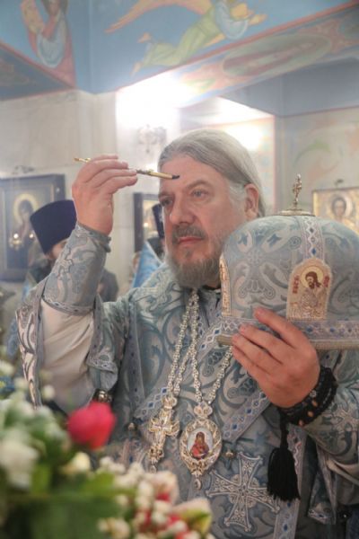 На утрене, после чтения Евангельского зачала, Владыка помазал духовенство и прихожан храма освященным елеем.