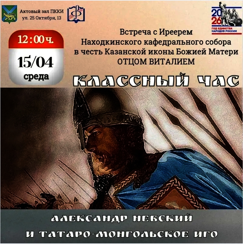15 апреля 2026 года иерей Виталий Шаркеев посетил Находкинский колледж искусств и встретился с учащимися. Темой беседы стало осмысление исторической роли князя Александра Невского в контексте сложных взаимоотношений Руси с Золотой Ордой в XIII веке.