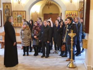 На следующем этапе программы маршрут поездки остановился в Православной гимназии. Здесь студенческая молодежь впервые посетила Кирилло-Мефодиевский храм, о котором рассказ вел сам настоятель – протоиерей Игорь Талько. Затем ребята прикоснулись к истории создания и деятельности гимназии, узнали много для себя нового о том, чем отличается обычная школа от православной. В конце всего они смогли воочию пообщаться со старшеклассниками и посмотреть презентацию. Напоследок гимназия угостила студентов вкусными булочками, выпеченными в собственной трапезной.