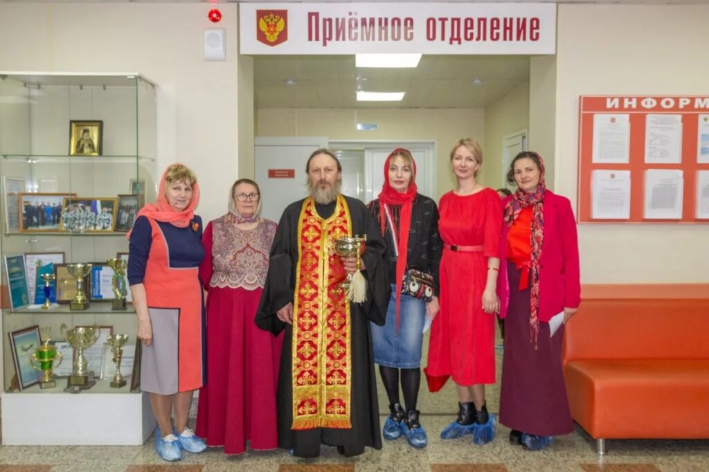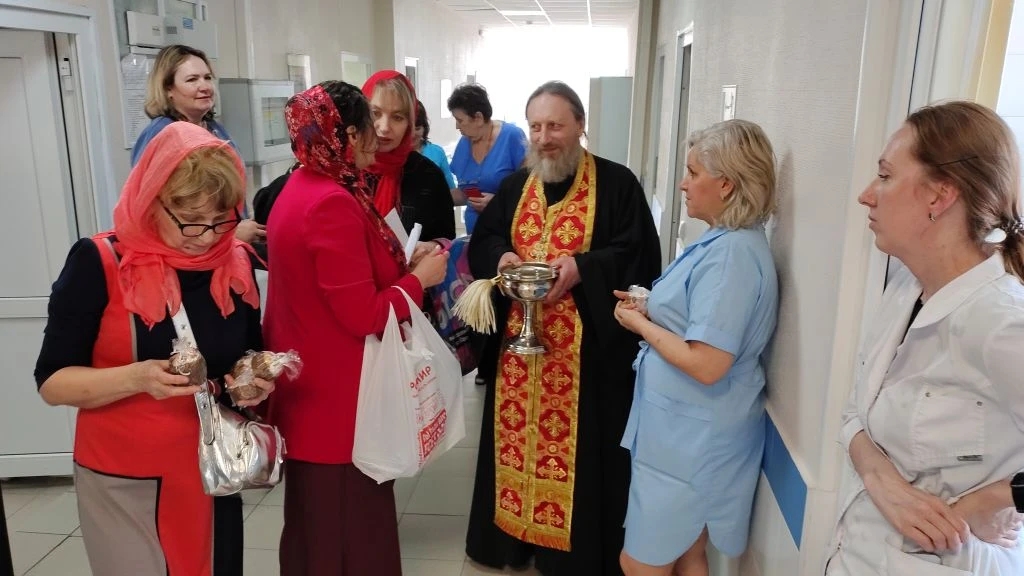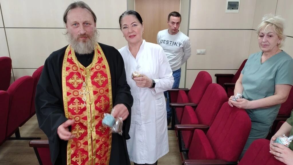 Затем отец Андрей вместе с добровольцами прошёл по отделениям. В каждой палате звучал пасхальный тропарь «Христос воскресе из мертвых…», батюшка кропил стены и кровати святой водой, а волонтёры раздавали пациентам куличи, которые накануне были выпечены на приходе.