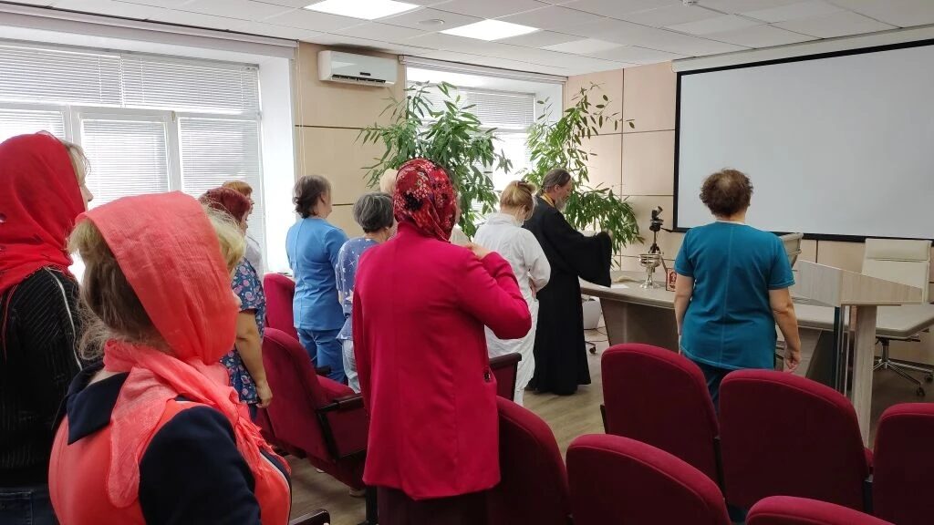 Визит начался с молебна в актовом зале центра, на который собрался медицинский персонал. Священник окропил всех святой водой, поздравил врачей и медсестёр с Пасхой и поблагодарил их за ежедневное служение ближним.