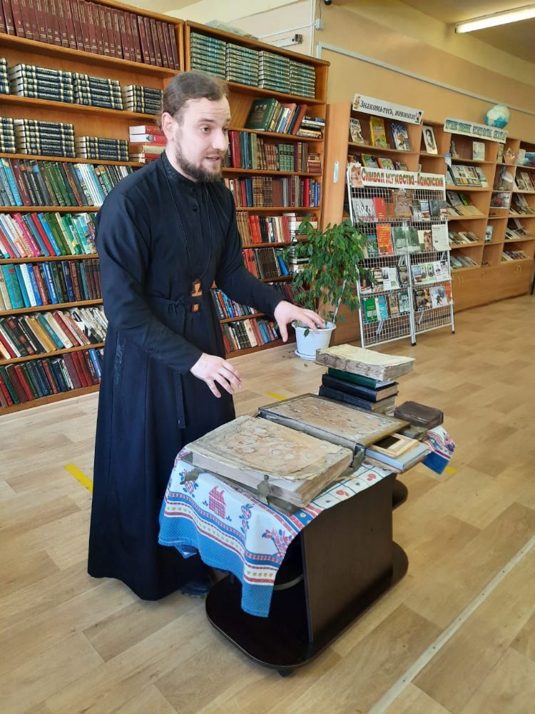 Затем отец Владимир рассказал сотрудникам библиотеки, педагогам Воскресной школы и детям о первом книгопечатнике Иване Федорове, о значении Православной книги в формировании русской культуры, о ценности русского и церковно-славянского языка и показал старинные экземпляры богослужебных книг, среди которых Евангелие конца 19го века, богослужебный сборник 1800 года, молитвослов 1911 года и другие.