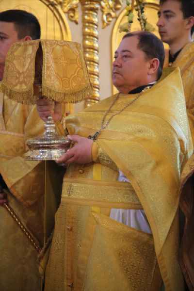 Ключарь собора иерей Владимир Плотников от имени клира и прихожан поздравил владыку и преподнес ему букет цветов.