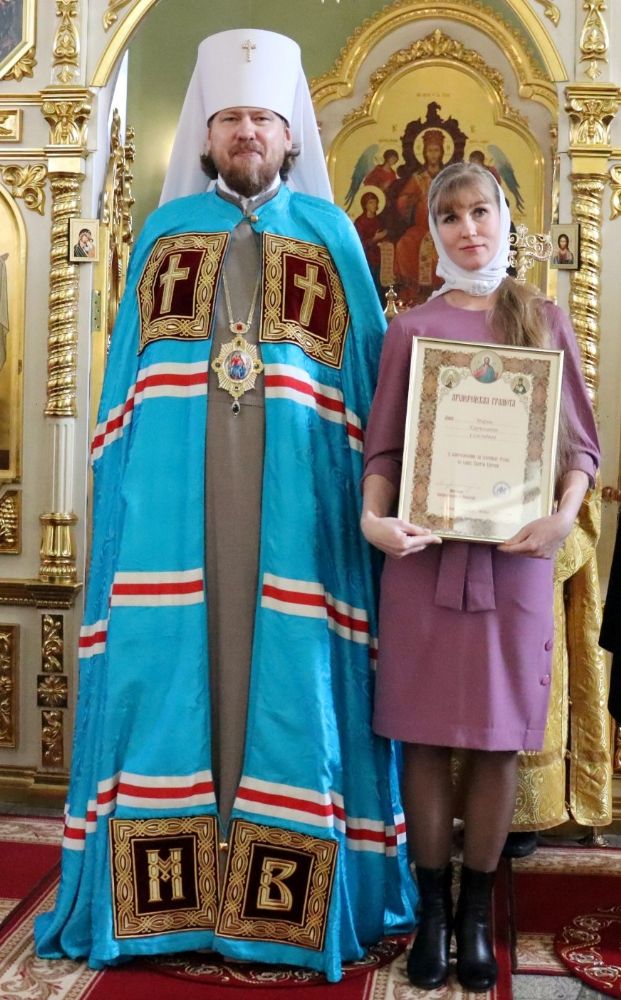 Архиерейских грамот были удостоены главный бухгалтер Владивостокской епархии М.К. Селезнёва и певчие Митрополичьего хора Покровского собора Н.М. Курохтина, С.А. Фенюков, Н.С. Гриценко, М.Н. Калчева, Е.В. Шумейко, Т.В. Осадчая и Е.В. Морозова в благословение за усердные труды во славу Святой Церкви.