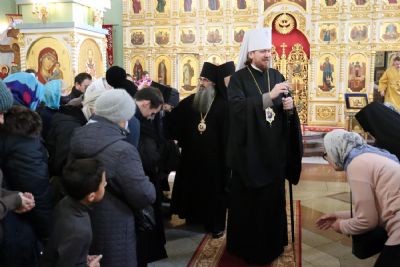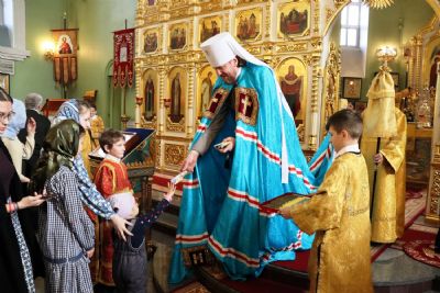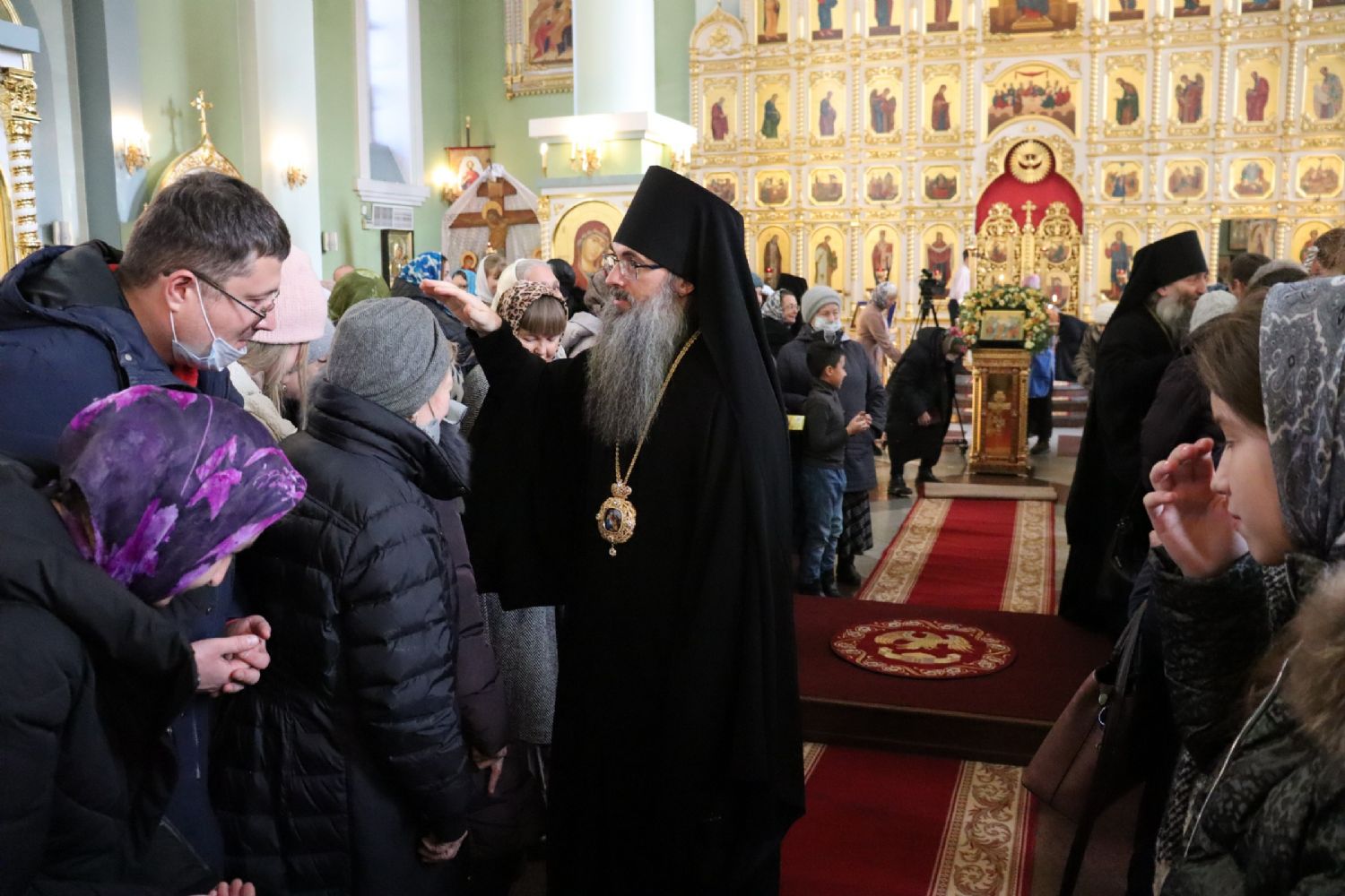 Митрополит Владимир поздравил молящихся с воскресным днем, причастников — с принятием Святых Христовых Таин, и благословил вручить сладкие подарки всем детям, подошедшим ко Кресту.