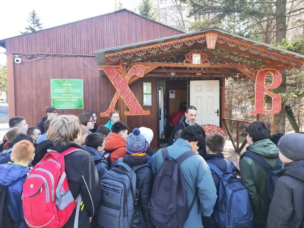13 апреля в храме святых благоверных князей Бориса и Глеба г. Владивостока настоятель иерей Алексий Синенко провёл экскурсию для учащихся 5-х и 8-х классов школы № 82. В ходе встречи отец Алексий подробно рассказал ребятам о главном христианском празднике — Пасхе, его духовном смысле и традициях. Батюшка поведал об особенностях богослужения в этот день, а также о книгах, которые используются во время церковных служб. Дети с интересом слушали рассказ священнослужителя, задавали вопросы и знакомились с внутренним устройством храма.
