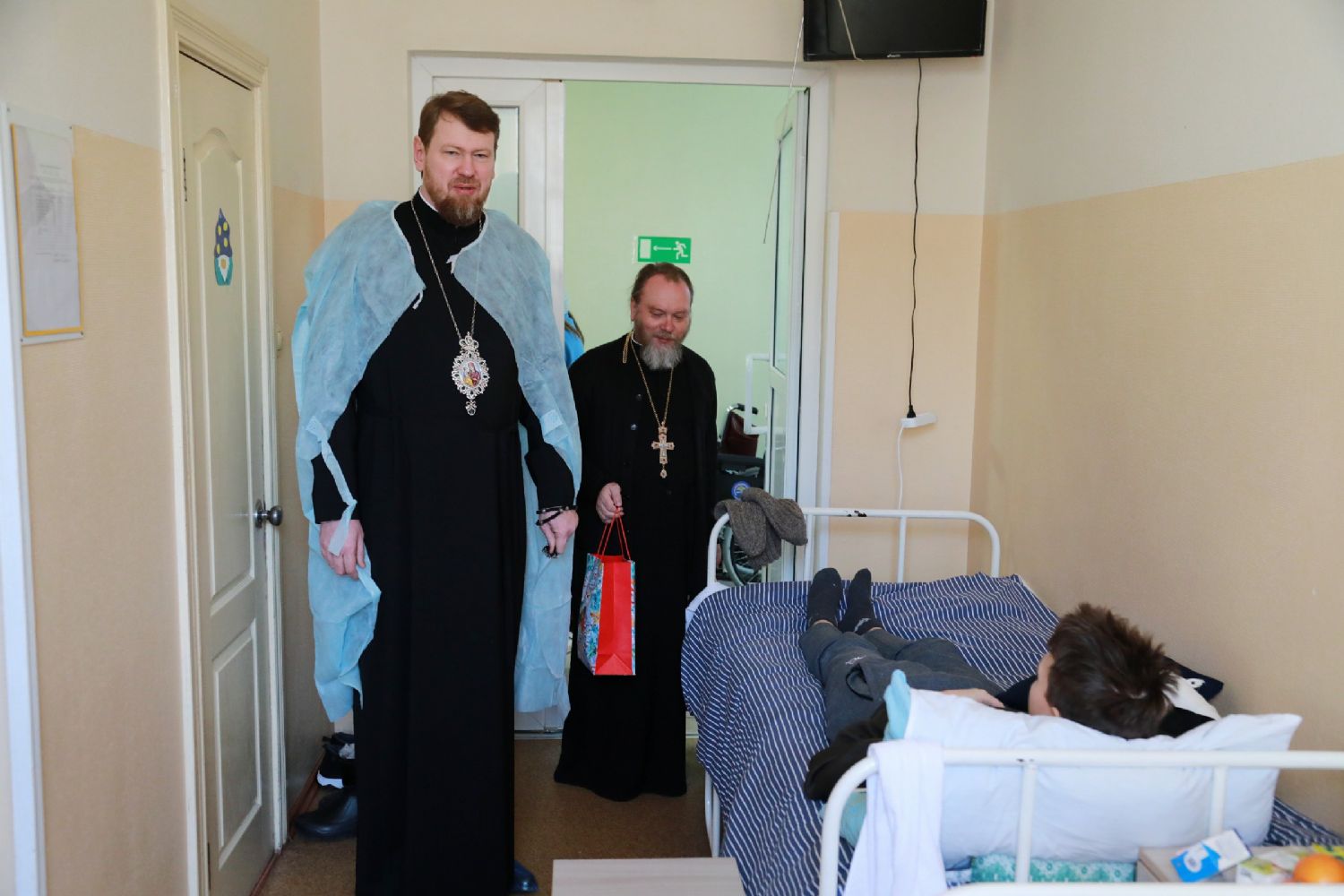 Владыка передал пациентам госпиталя книги митрополита Вениамина (Пушкаря) «Священная Библейская история», иконы праздника Рождества Христова и Спасителя, нательные крестики, воинские молитвословы и сладкие подарки.