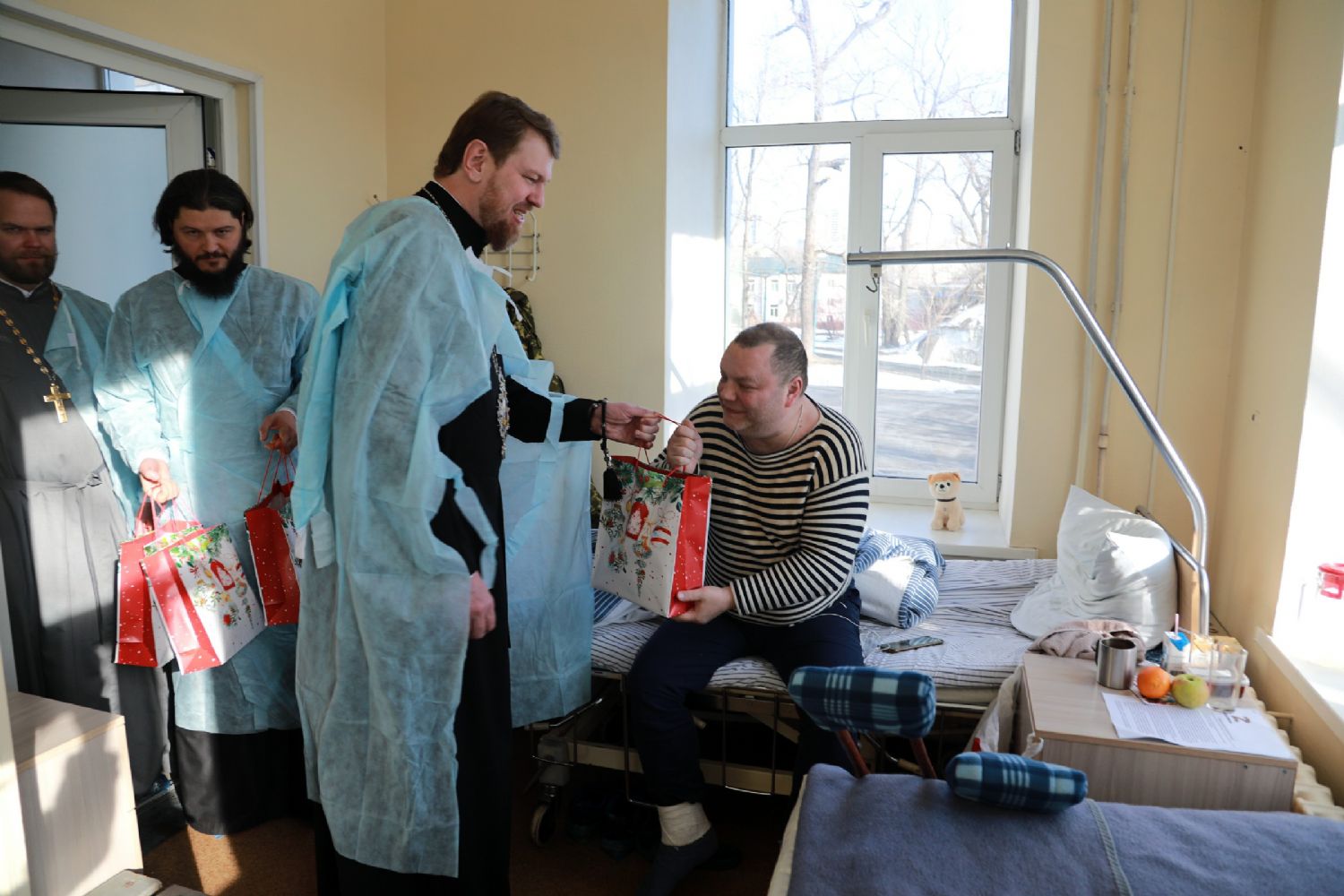 Глава Приморской митрополии поздравил раненых военнослужащих и участников спецоперации, находящихся на лечении, и подарил им подарки, а также поблагодарил за службу, пожелал воинам скорейшего выздоровления и силы духа.