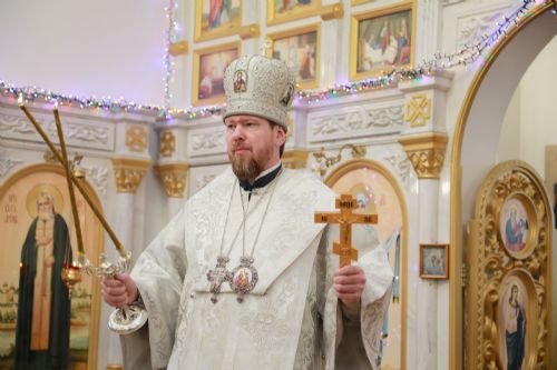 В завершение богослужения настоятель храма протоиерей Сергий Бирюк от имени клира и прихожан поблагодарил владыку за совместную молитву, поздравил с праздником Рождества Христова и преподнес ему букет цветов.