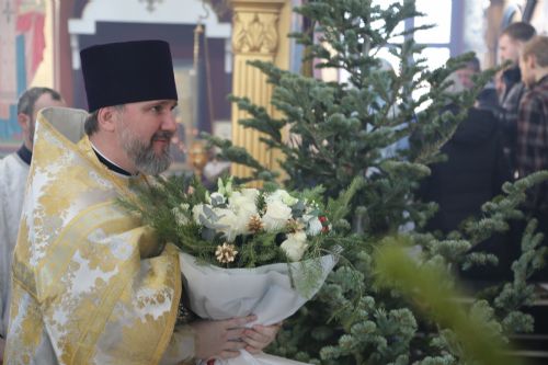 Затем настоятель храма протоиерей Сергий Якутов поздравил владыку Владимира с праздником и преподнес букет цветов.