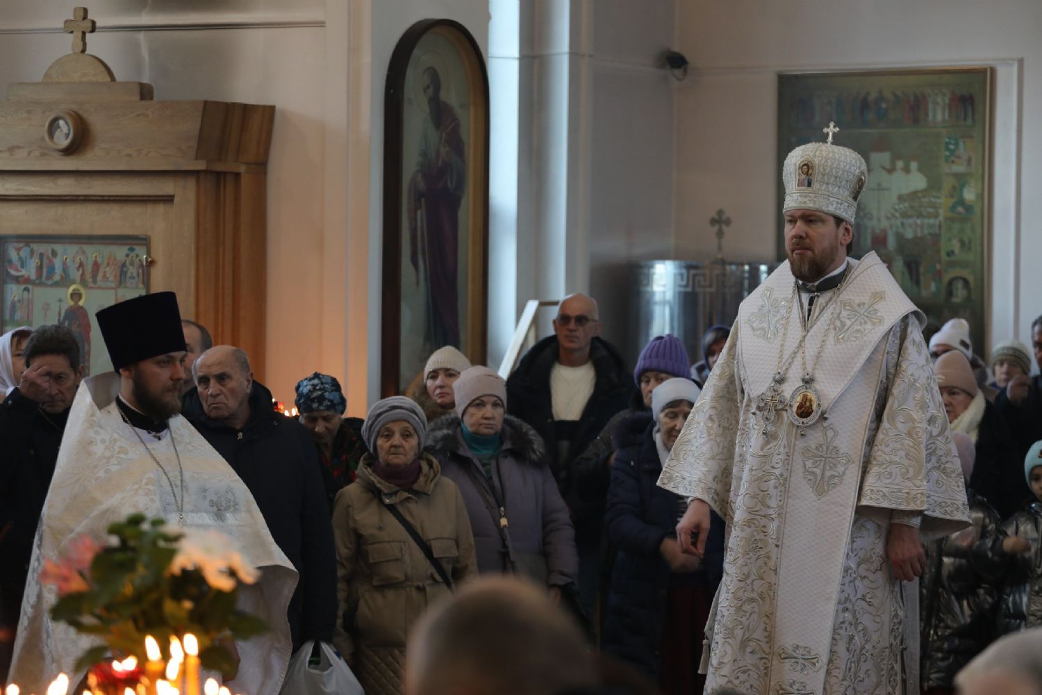 Настоятель храма протоиерей Иоанн Сергеев от имени клира и прихожан поблагодарил владыку за совместную молитву, поздравил с праздником Богоявления и преподнес букет цветов.
