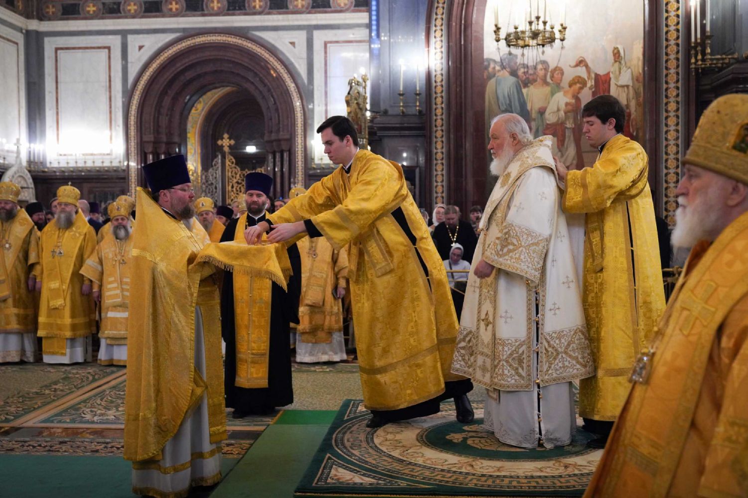 Также Предстоятелю Русской Православной Церкви сослужили: протопресвитер Владимир Диваков, секретарь Патриарха Московского и всея Руси по г. Москве; протоиерей Михаил Рязанцев, ключарь Храма Христа Спасителя; архимандрит Алексей (Туриков), личный секретарь Святейшего Патриарха Кирилла; сотрудники Синодального отдела религиозного образования и катехизации и руководители епархиальных отделов религиозного образования и катехизации в священном сане, члены делегации Крымской митрополии в священном сане, духовенство г. Москвы.