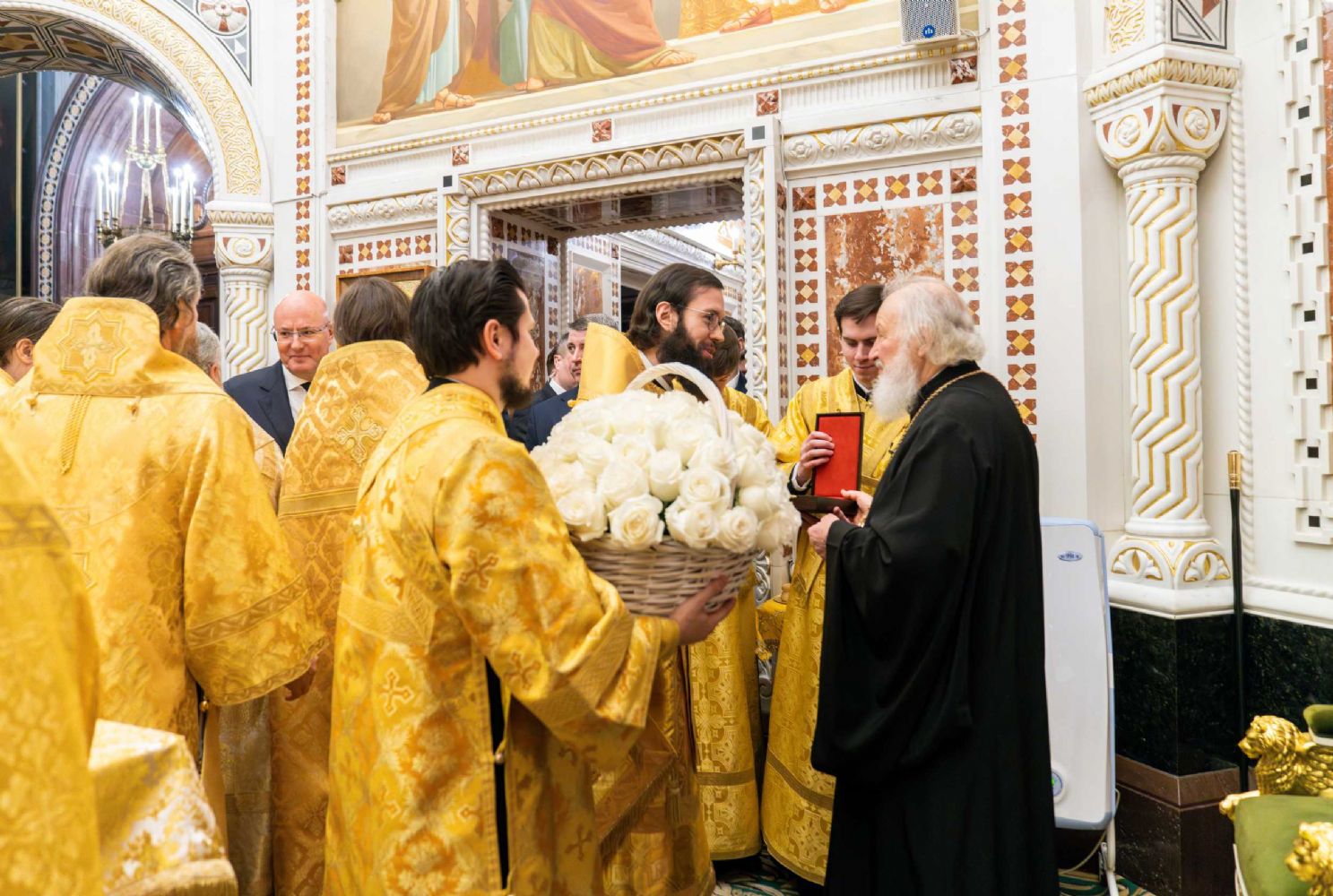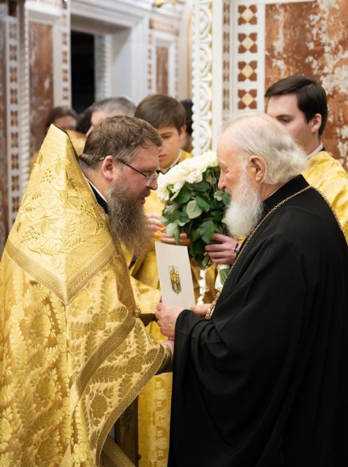 По окончании Литургии, после «Многолетия», митрополит Воскресенский Григорий огласил поздравительный адрес от членов Священного Синода Русской Православной Церкви Святейшему Патриарху Кириллу с 15-летием интронизации.