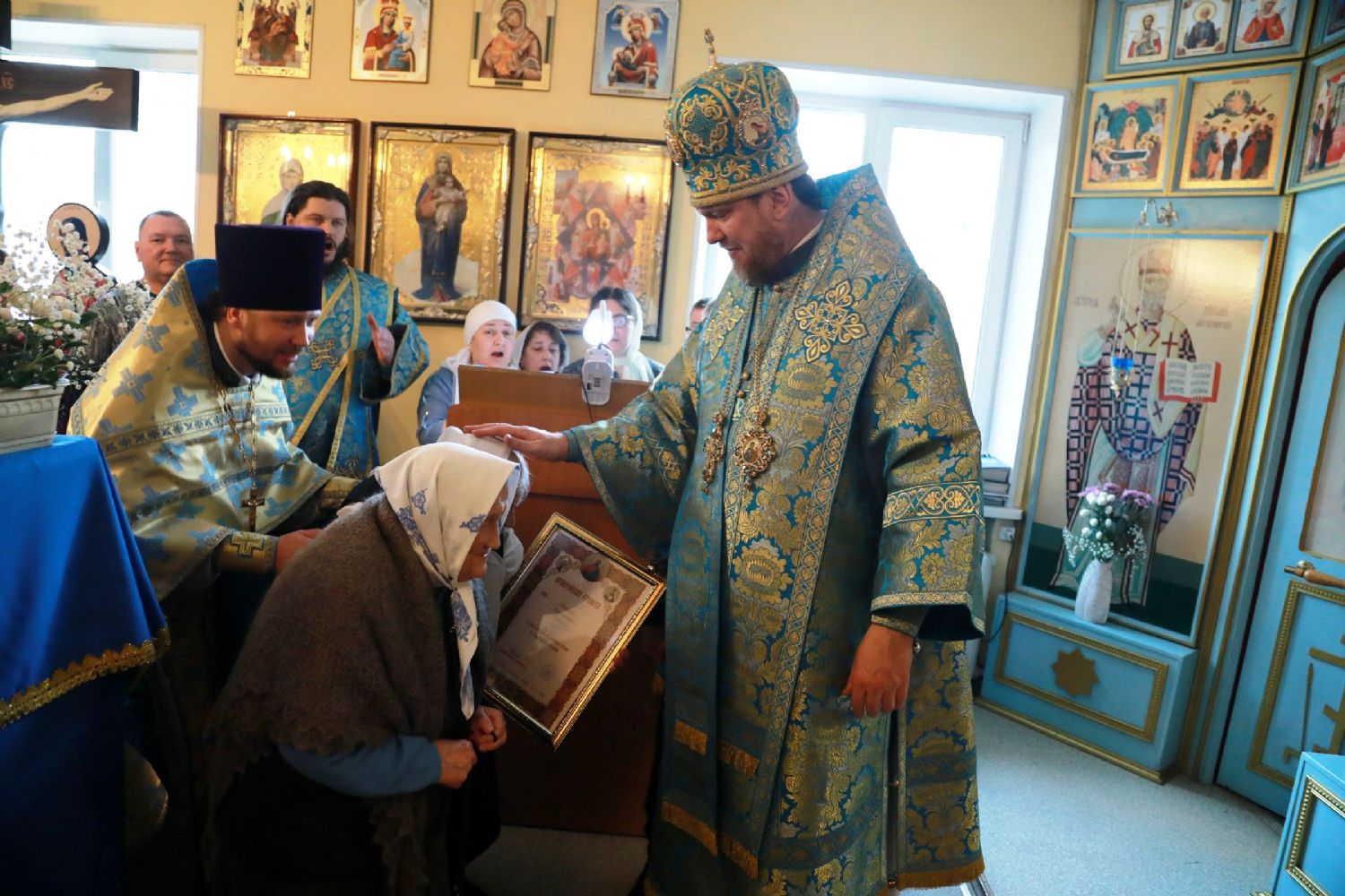 Затем глава Приморской митрополии совершил награждение тружениц храма. Во внимание к усердным трудам на благо Владивостокской епархии медали «За церковные заслуги перед Владивостокской епархией» II степени была удостоена Т.В. Кравцова. В благословение за усердные труды во славу Святой Церкви архиерейских грамот были удостоены Н.К. Чупилка, В.Т. Москалева, Г.В. Михайлова.