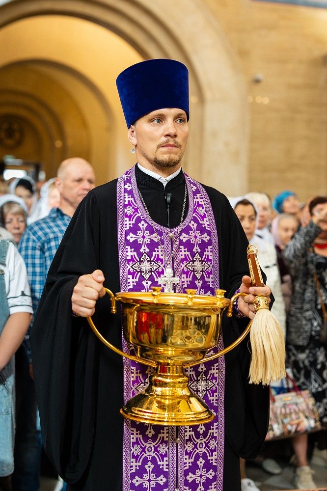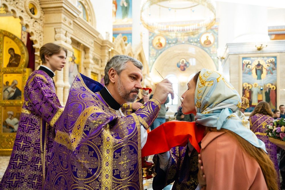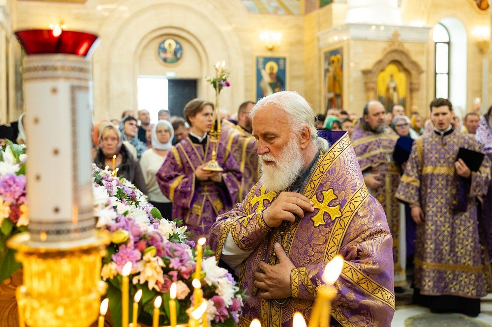 По заамвонной молитве сонм духовенства совершил славление празднику Воздвижения Креста Господня.