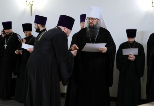 После доклада правящий архиерей вручил свидетельства об окончании курсов повышения квалификации в Хабаровской духовной семинарии.