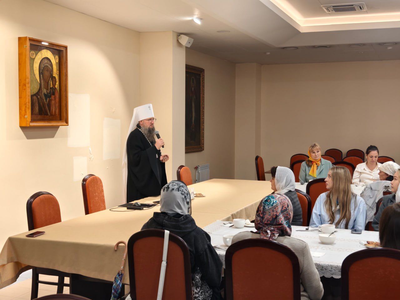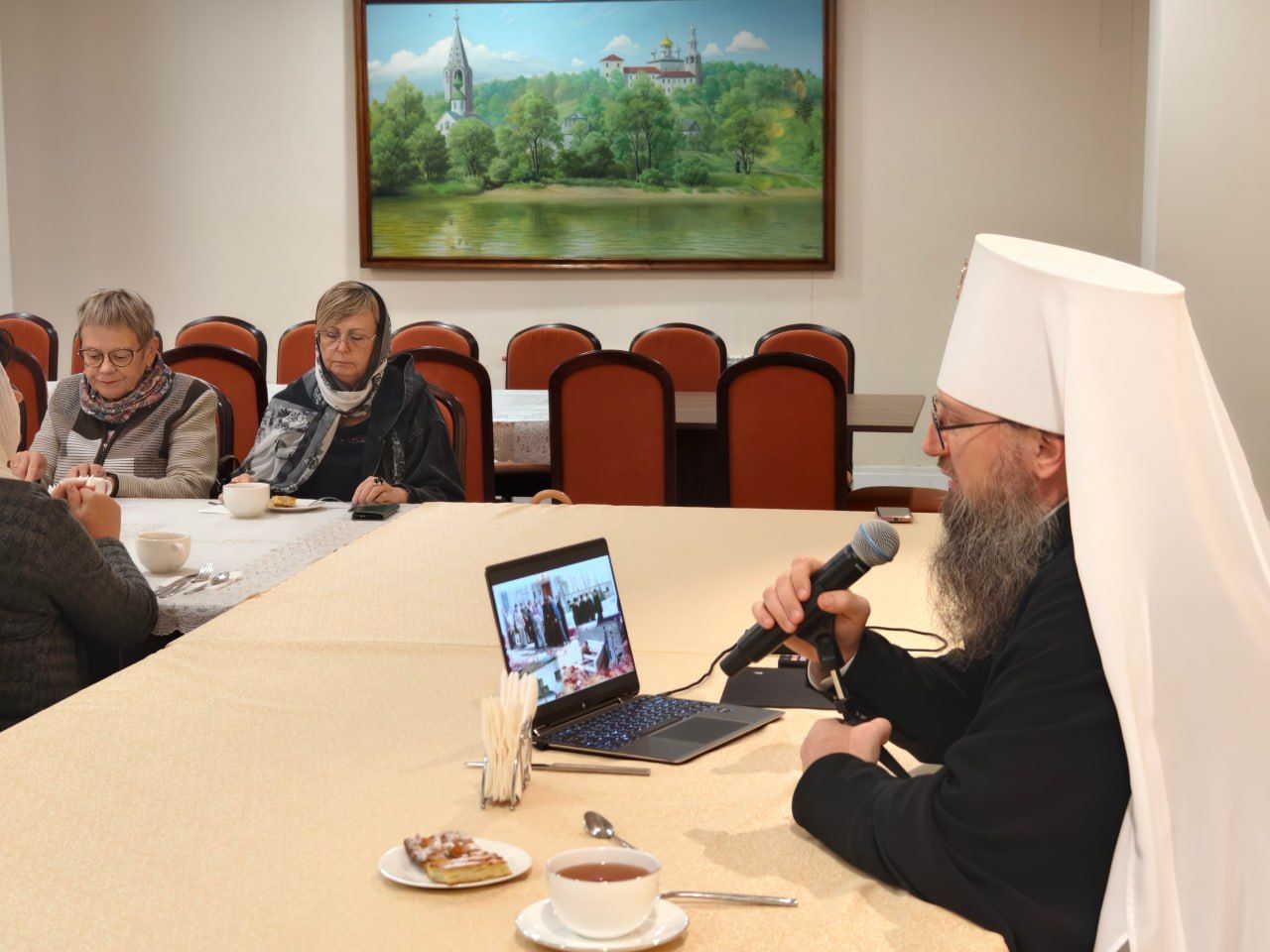 Беседа продолжилась в трапезной, за столами с чаем и пирогом. Владыка рассказал о своём жизненном и духовном пути, а через него — о буднях и праздниках Церкви, о служении Христовой истине, о верности Богу и любви к людям.