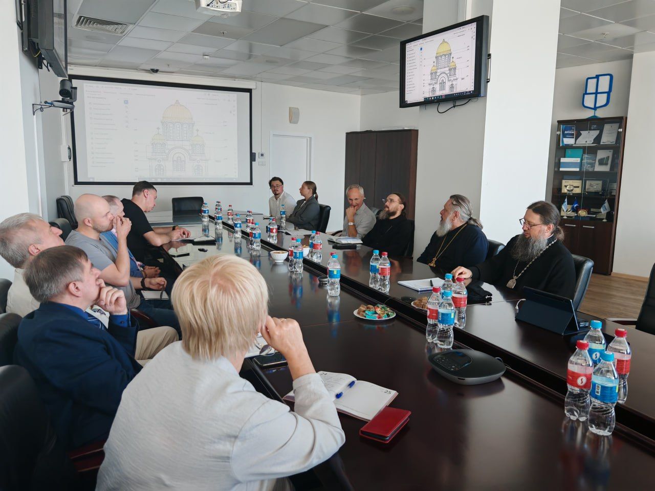 Обсуждена возможность участия студентов и преподавателей Политехнического института ДВФУ в разработке карты росписи храма (фресок и орнаментов) и её стилистической концепции. Студенты также смогут помочь в создании 3D-визуализации проекта.