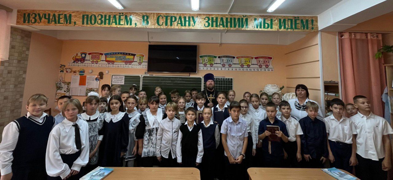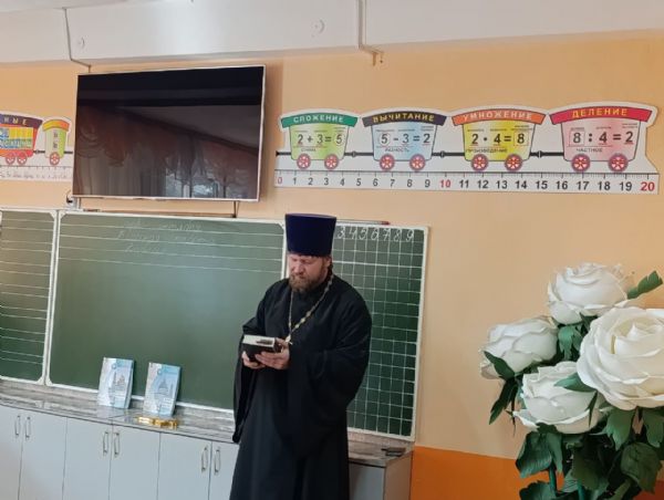Отец Владимир уже не первый раз выступает перед детьми в данном учебном заведении в рамках школьного курса «Основы православной культуры». Батюшка начал урок словами из Евангелия от Иоанна: «Исследуйте Писания, ибо вы думаете чрез них иметь жизнь вечную; а они свидетельствуют о Мне» (Ин. 5, 39). Ученики ознакомились с принесёнными из храма Библией, Псалтирью и Четвероевангелием. Отец Владимир рассказал не только о Священном Писании Ветхого и Нового Завета (структуре, месте, времени написания и другой интересной информации), но и о Святой Троице, Господе Иисусе Христе, Крестной смерти и Воскресении, евангельских заповедях и спасении людей. В конце встречи священник ответил на вопросы ребят и угостил их просфорами из храмовой пекарни.