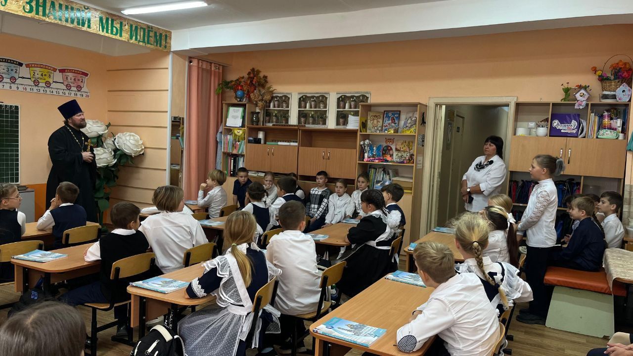 1 октября в СОШ № 8 г. Спасска-Дальнего по приглашению руководства школы иерей Владимир Коротких, настоятель храма Преображения Господня, встретился с учениками двух четвёртых классов. Всего на встрече присутствовало около 40 ребят.