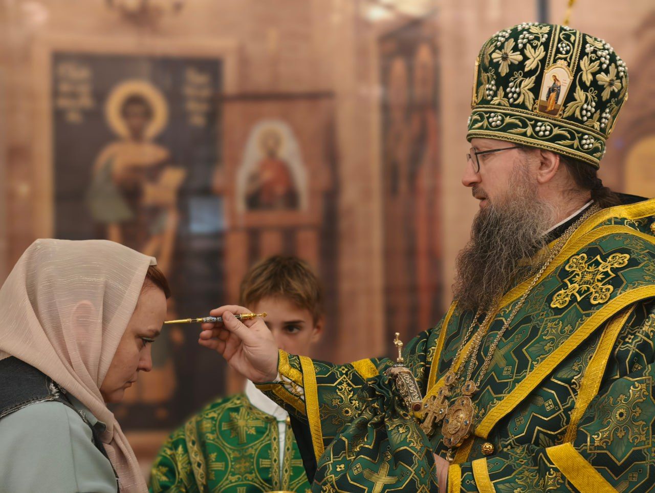 После литии владыка совершил благословение и освящение пяти хлебов, вина и елея, а в начале канона совершил помазание молящихся освященным елеем.