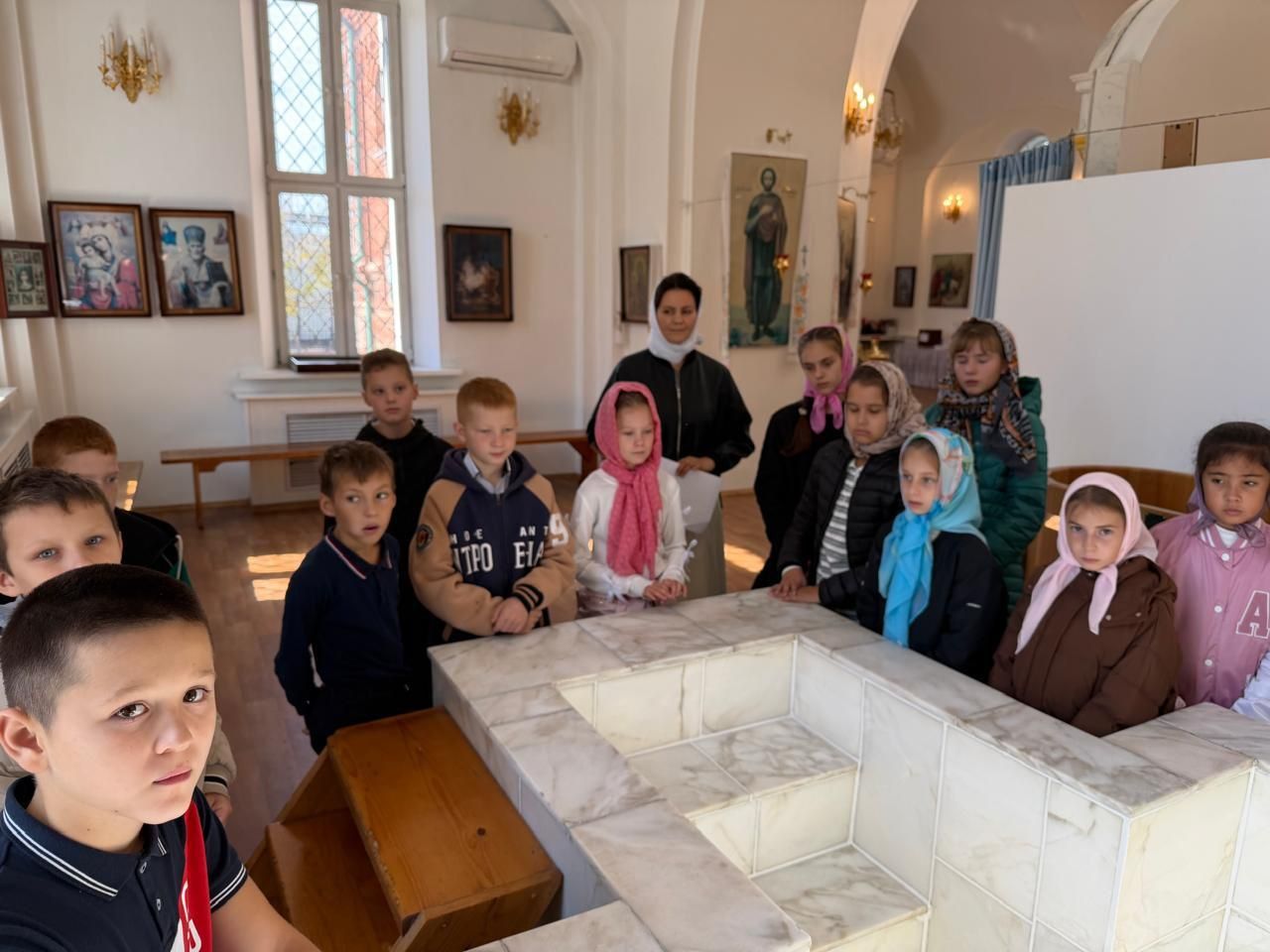 Настоятель храма, протоиерей Сергий Бирюк, и преподаватель Воскресной школы, Виктория Владимировна Костерина, провели экскурсию по храму, рассказали о его внутреннем убранстве и святынях, а также о роли веры и Церкви в жизни человека. Школьники с неподдельным интересом рассматривали иконы святых и слушали краткие рассказы о их житии.