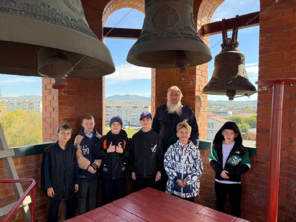 После экскурсии батюшка пригласил школьников на совместное чаепитие. В завершение мероприятия все желающие поднялись на колокольню и попробовали себя в роли звонарей.