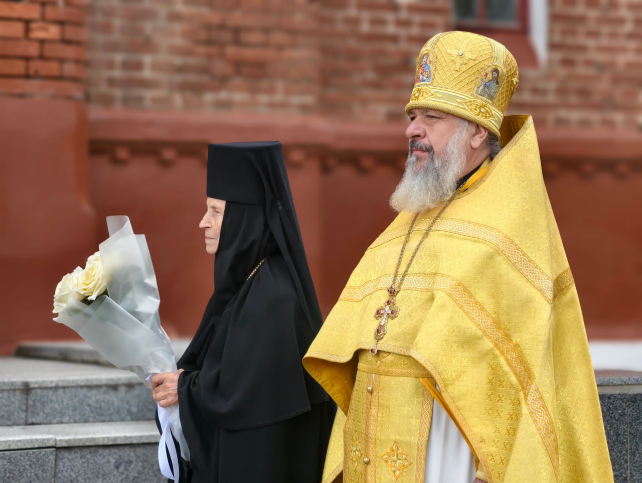 На входе в храм настоятельница обители игумения Варвара (Волгина) поблагодарила владыку Павла за архипастырский визит и преподнесла ему букет белых роз.