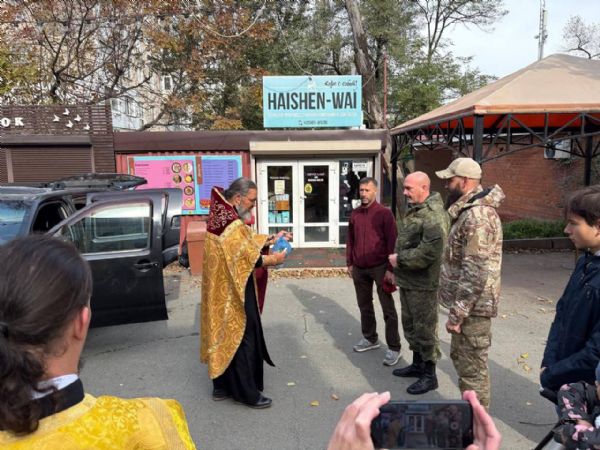 После на территории храма освятили два автомобиля, которые будут отправлены воинам 155-ой бригады морской пехоты. От себя прихожане также передали бойцам молитвословы и иконки с пожеланиями Божией помощи.