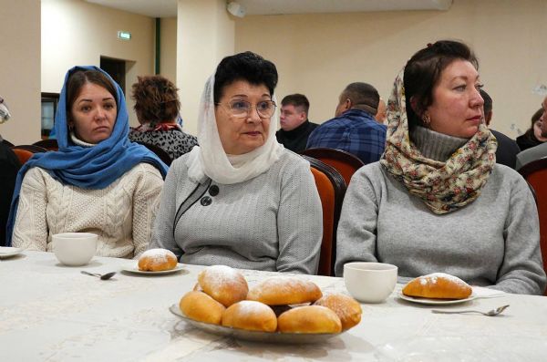 После этого все участники экскурсии разместились в трапезной за столами с чаем и сладкой выпечкой. Митрополит Павел поделился историями из своего жизненного и духовного опыта, показал фото, запечатлевшие яркие моменты его пребывания в Архангело-Михайловском монастыре с. Козиха и служения на кафедрах Ейской и Душанбинской епархий.