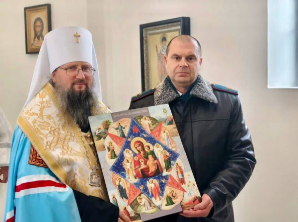 Затем правящий архиерей вручил Роману Геннадьевичу икону Божией Матери «Неопалимая Купина», в честь которой возведена часовня и которая является покровительницей всех огнеборцев. Также глава митрополии наградил архиерейскими благодарностями сотрудников ведомства, силами которых была построена часовня.