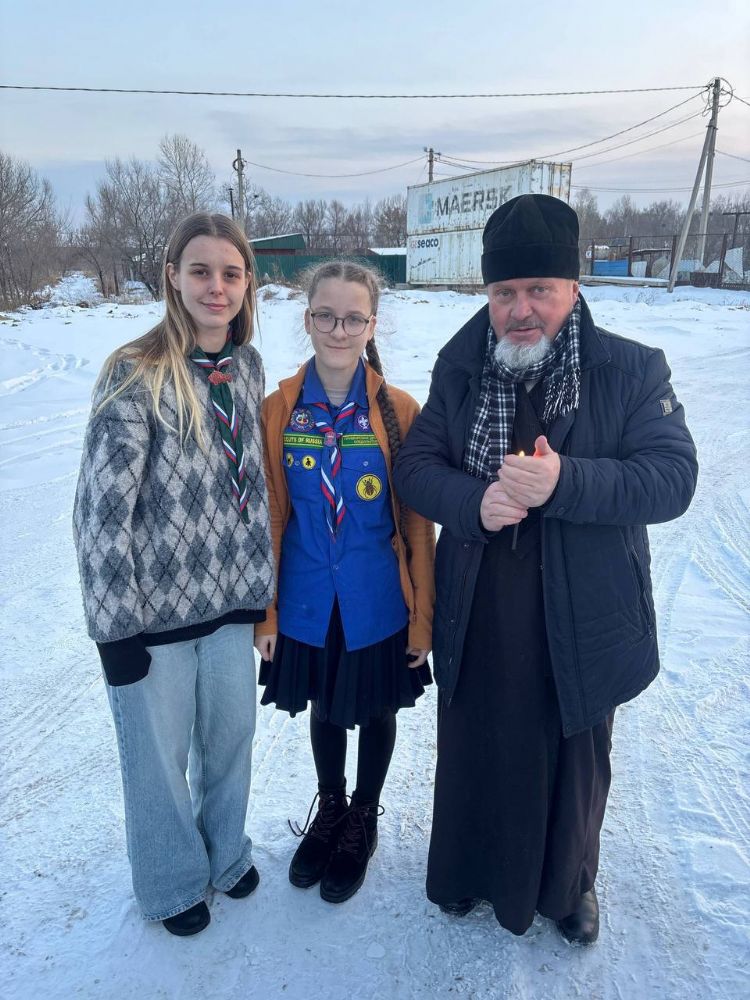 Ольга Гордеева, Мария Кудрина, Степан Перминов и Тимофей Вовна, члены Приморской дружины Братства православных следопытов, доставили Вифлеемский огонь из г. Хабаровска в г. Владивосток. По пути ребята передали огонь в храм иконы Божией Матери «Скоропослушница» г. Лучегорска, храм Нерукотворного образа г. Дальнереченска, храм Вознесения г. Спасск-Дальнего и храм Николая Чудотворца г. Уссурийска.