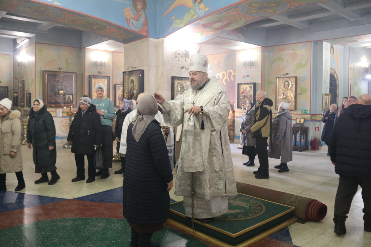 На утрене всенощного бдения Преосвященный Владыка помазал духовенство и прихожан освященным елеем.