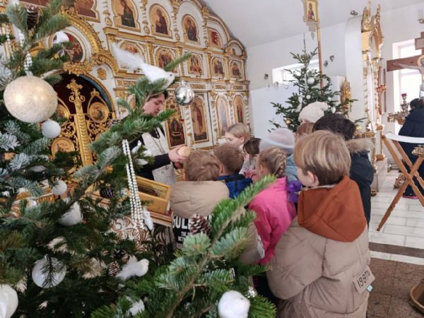 Знакомство с храмом началось с рассказа об устройстве алтаря и богослужебных предметах: кресте, Евангелии и кадиле. Также дети узнали о Таинстве Причастия. В завершение беседы батюшка угостил ребят просфорой и предложил испить крещенской воды.