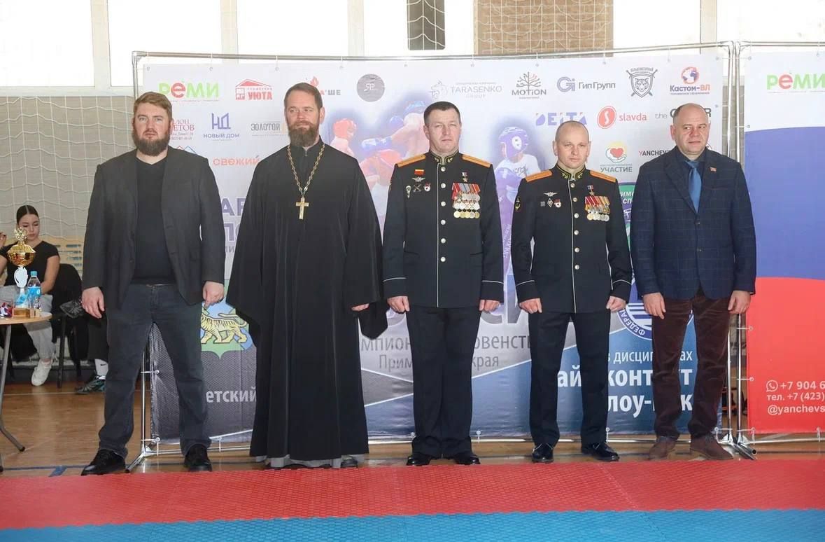 Также с пастырским словом к собравшимся обратился руководитель комиссии по вопросам физической культуры и спорта Владивостокской епархии иерей Даниил Есаков. Отец Даниил благословил участников чемпионата и рассказал о пользе боевых видов спорта для подрастающего поколения. Также батюшка раскрыл духовную составляющую тренировок и призвал всех жить в вере, совмещая спорт и христианские ценности.