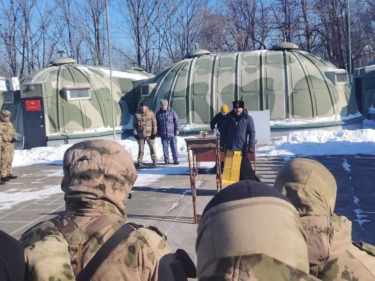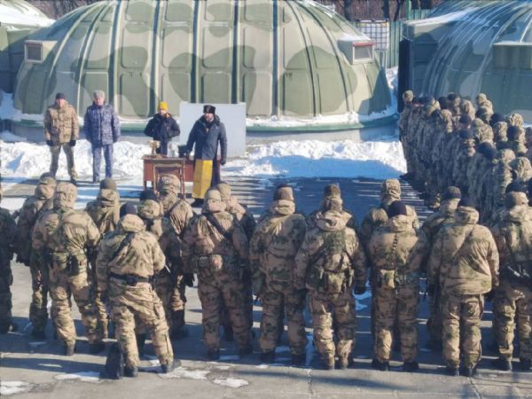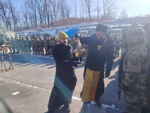 8 февраля на тренировочном полигоне г. Артёма состоялось построение подразделений, готовящихся к убытию в зону боевых действий СВО. По сложившейся традиции перед выполнением служебных задач военнослужащих благословил священник.
