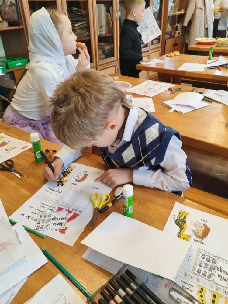 В ходе занятия ребята также познакомились с житием преподобного Иоанна Лествичника, выполнили аппликацию и продолжили работу над православной книжкой-гармошкой, дополнив её темой четвёртой недели Великого поста. Завершился учебный день уроком церковнославянского языка: дети изучали букву «Живете» и работали с прописями.
