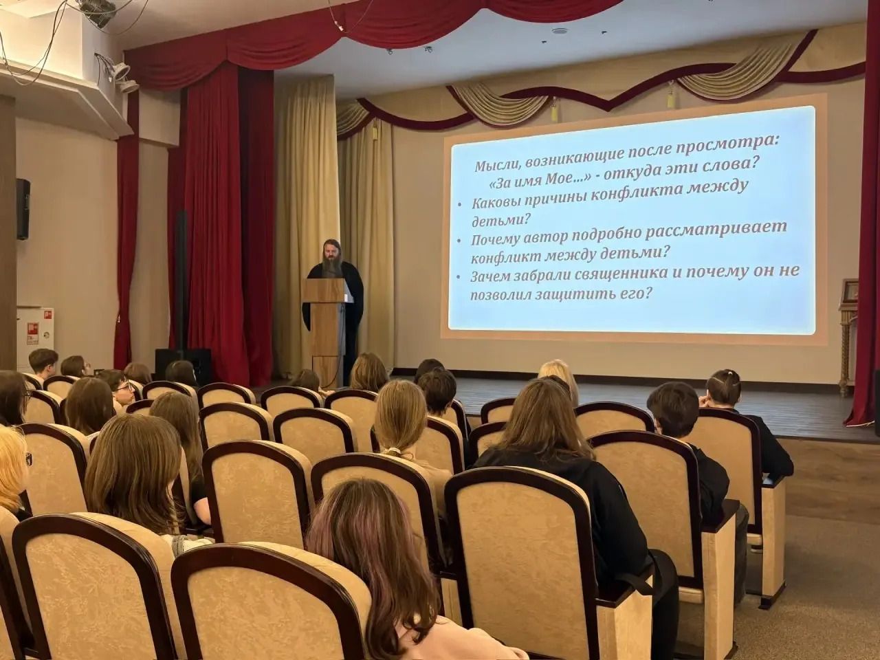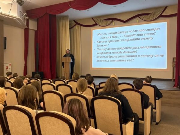 После экскурсии в зале Церковных собраний собравшимся был показан фильм «За имя Мое…». Иеромонах Марк (Корнилов) подробно раскрыл смысл просмотренной картины, объяснил значение её названия и ответил на вопросы гостей.
